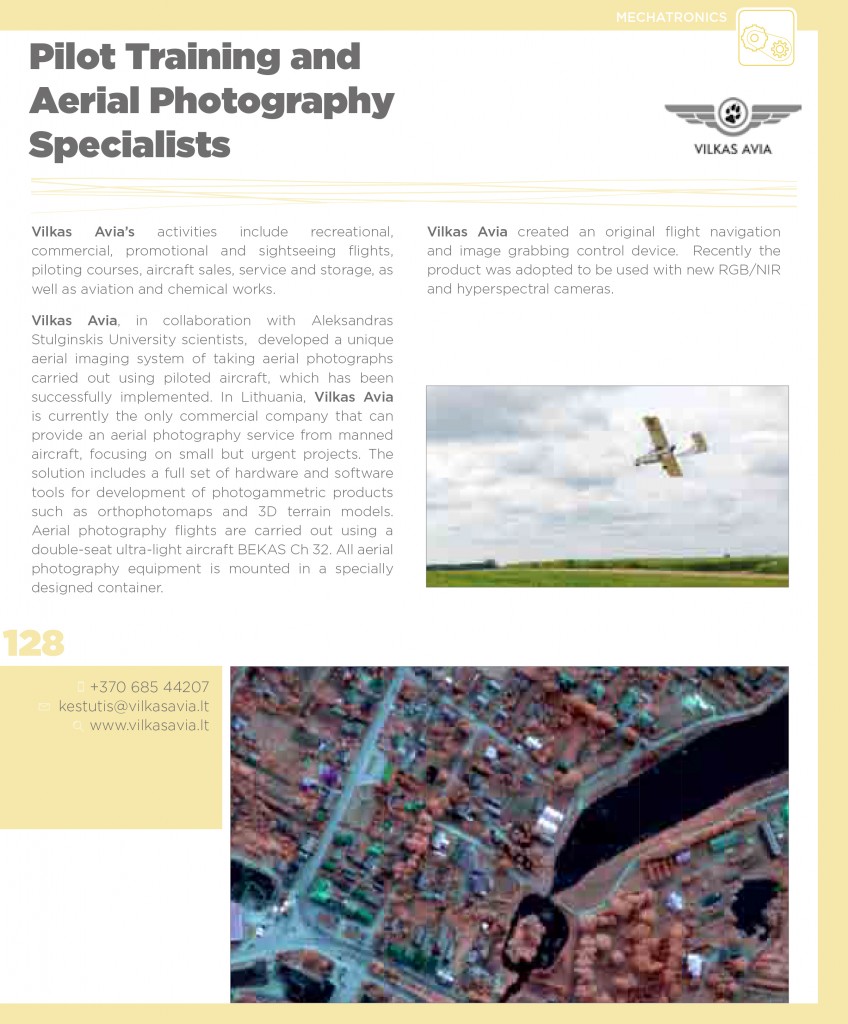 Vilkas Avia’s activities include recreational, commercial, promotional and sightseeing flights, piloting courses, aircraft sales, service and storage, as well as aviation and chemical works. Vilkas Avia, in collaboration with Aleksandras Stulginskis University scientists, developed a unique aerial imaging system of taking aerial photographs carried out using piloted aircraft, which has been successfully implemented. In Lithuania, Vilkas Avia is currently the only commercial company that can provide an aerial photography service from manned aircraft, focusing on small but urgent projects. The solution includes a full set of hardware and software tools for development of photogammetric products such as orthophotomaps and 3D terrain models. Aerial photography flights are carried out using a double-seat ultra-light aircraft BEKAS Ch 32. All aerial photography equipment is mounted in a specially designed container.
